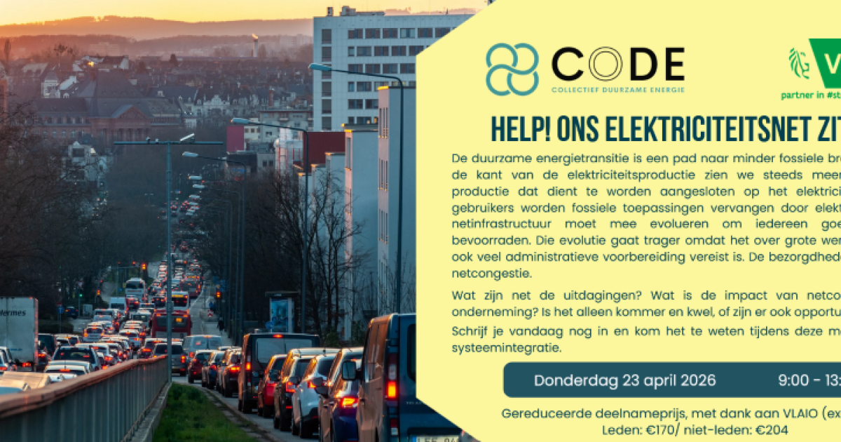 Dit event wordt in het kader van het Collectief Duurzame Energie (CoDE), een onderdeel van het VLAIO Netwerk, tot stand gebracht en ondersteunt bedrijven bij hun duurzame transitie.