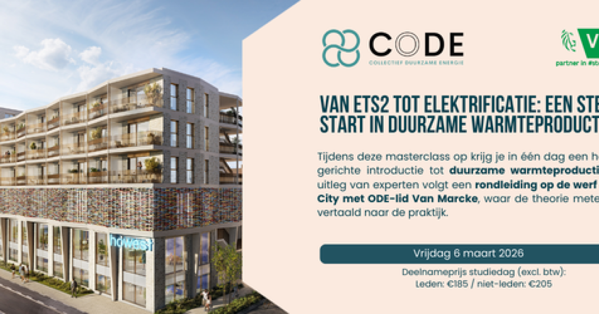 Tijdens deze masterclass op 6 maart 2026 krijg je in één dag een heldere en gerichte introductie tot duurzame warmteproductie. Na de uitleg van experten volgt een rondleiding op de werf van Kaai City met ODE-lid Van Marcke, waar de theorie meteen wordt vertaald naar de praktijk.
